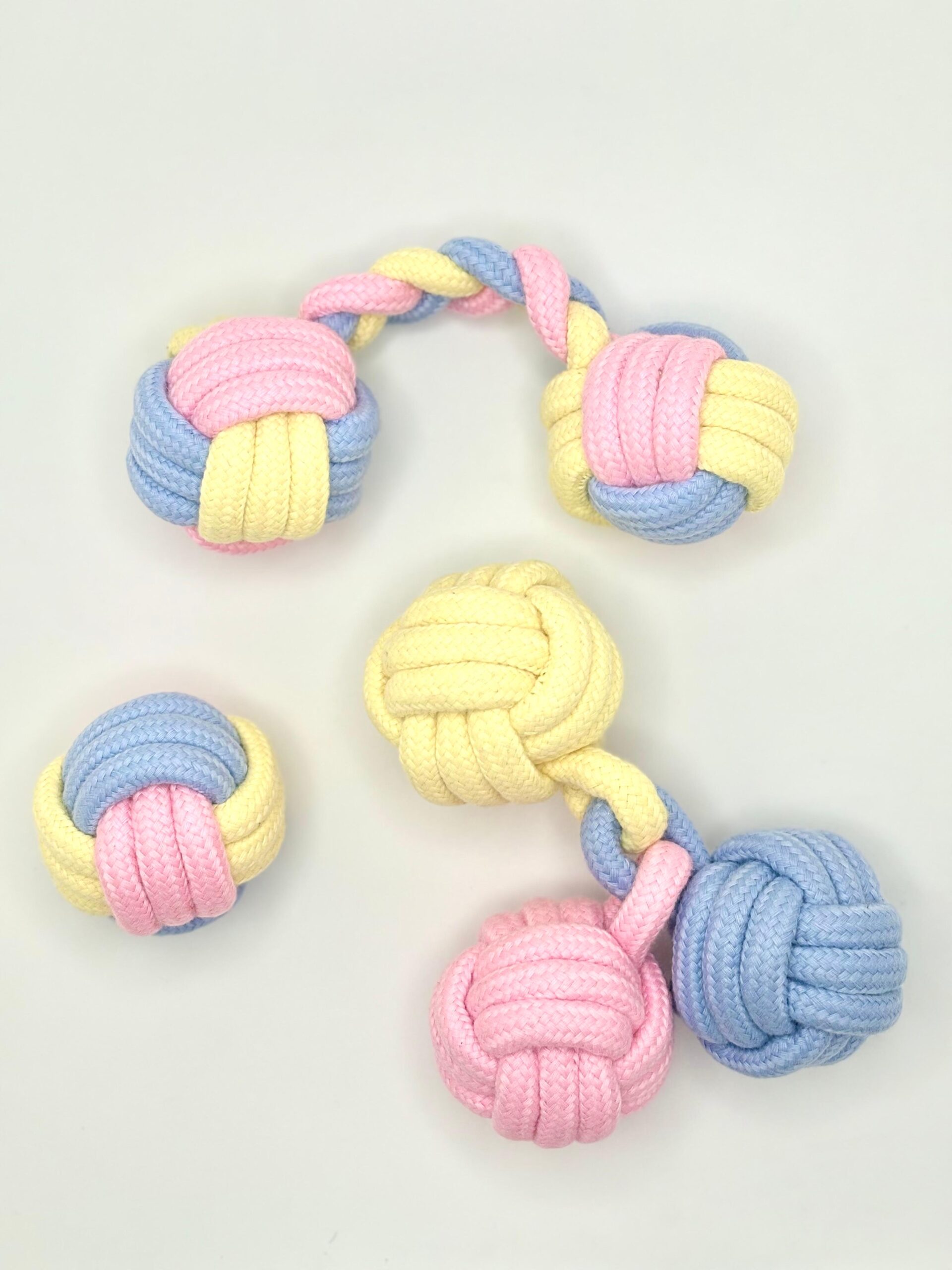 Fun, colorful rope ball toys designed for chewing, tossing, and fetching. Made from cotton rope for durability and dental benefits.